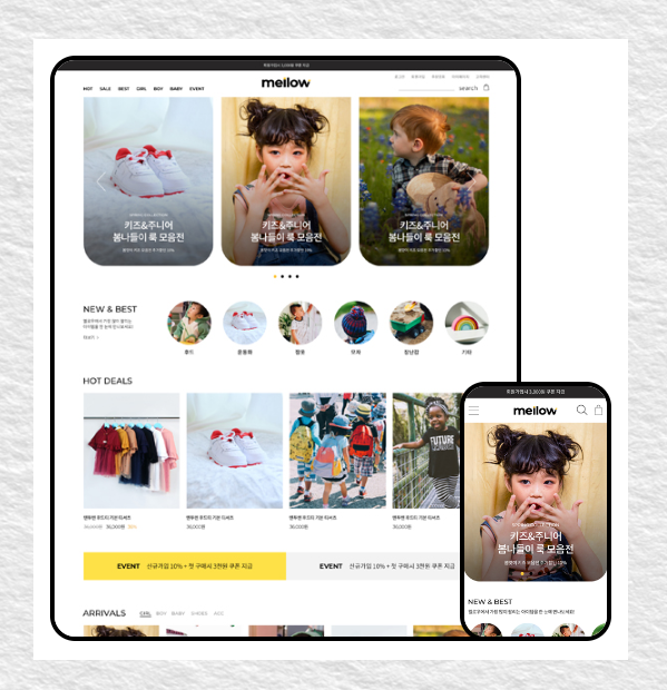 디자인교과서의 수많은 스킨 중에서도 멜로우 스킨으로 세팅한 쇼핑몰이에요.
