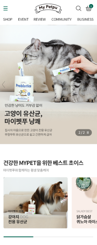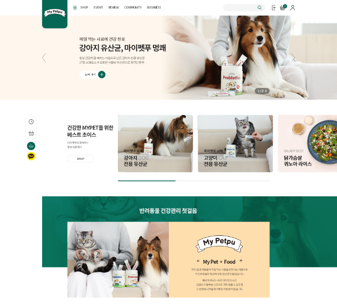 오늘은 디자인 스킨 실제 적용 사례 쇼핑몰 마이펫푸를 소개합니다.