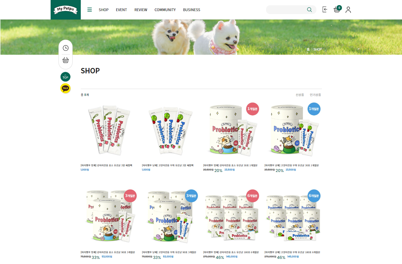 이로써 카페24/고도몰 (반려동물 유산균) 디자인스킨 적용 사례 예시에 대해 알아보았습니다.